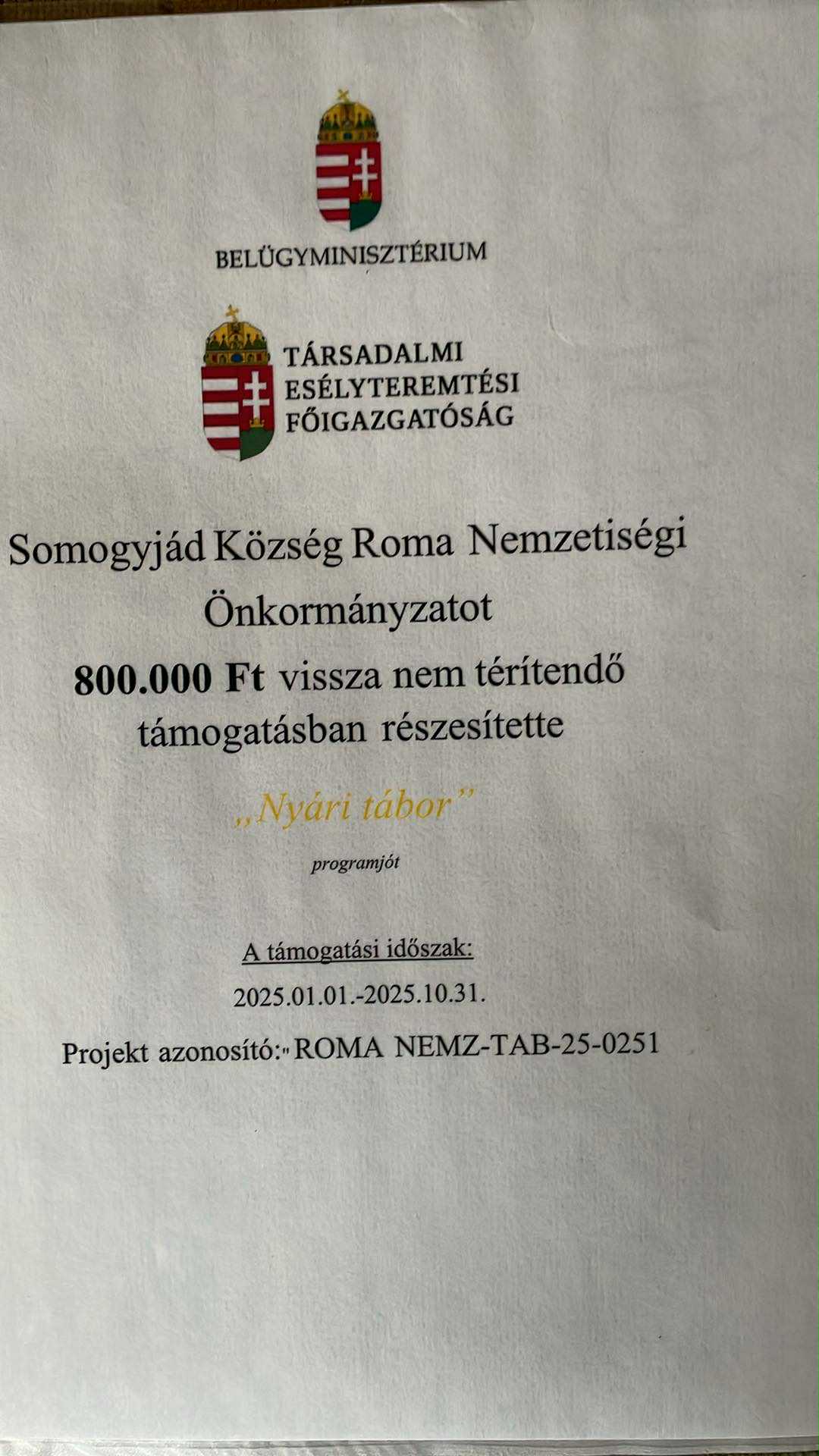 Nyári táborunkat támogatta a Belügyminisztérium Társadalmi Esélyteremtési Főigazgatóság 800.000 Ft-al, melyet ezúton is köszönünk. Ennek is köszönhetően a résztvevő gyerekek családjainak teljesen ingyenesen volt meghirdetve a tábor, csak költőpénzt kellet biztosítani.